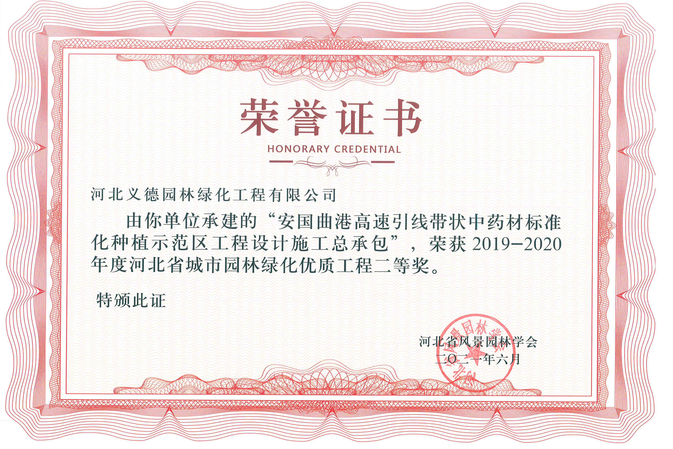 工程業(yè)績榮獲有2017-2018年度河北省城市園林綠化優(yōu)質(zhì)工程二等獎(jiǎng)兩個(gè);2019-2020年度河北省城市園林綠化優(yōu)質(zhì)工程二等獎(jiǎng)兩個(gè)、三等獎(jiǎng)兩個(gè);2018至2020年保定市燕趙杯優(yōu)質(zhì)工程五個(gè);2020年度石家莊市優(yōu)質(zhì)工程一個(gè)。